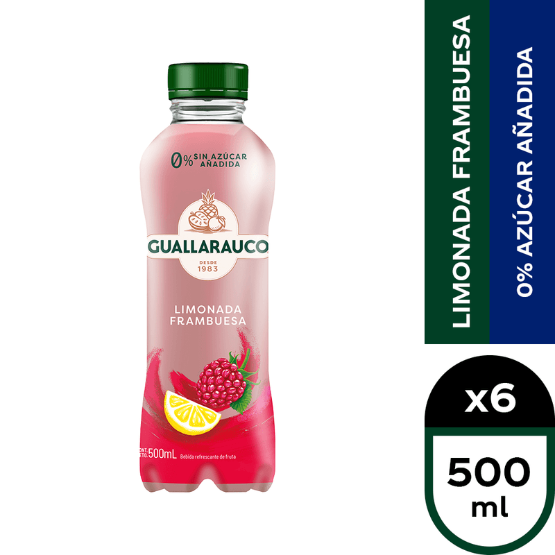 Mantente hidratado con la Limonada Guallarauco sabor Frambuesa en el formato botella 500 ml. Pack 6 unidades.