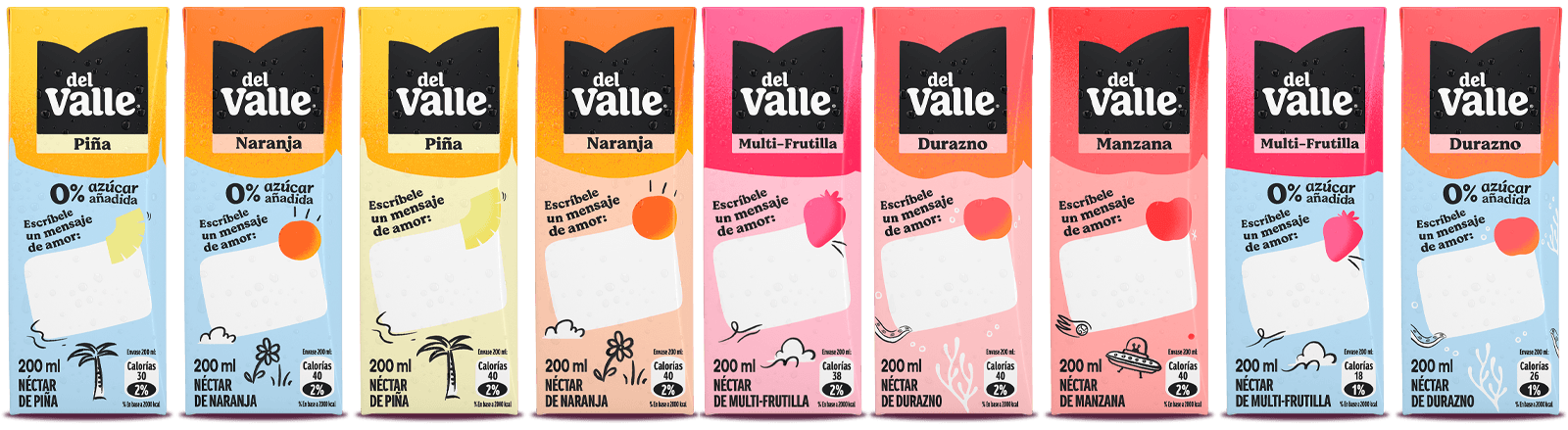 Recuérdale cuánto lo quieres en cada recreo! Con Jugos Del Valle, cada día es una oportunidad nueva para dedicarle un mensaje diferente que lo acompañe a donde vaya. Disfruta la frescura de siempre, el complemento ideal para una colación escolar rica y equilibrada. ¡Con Del Valle, escríbele un mensaje con cariño!