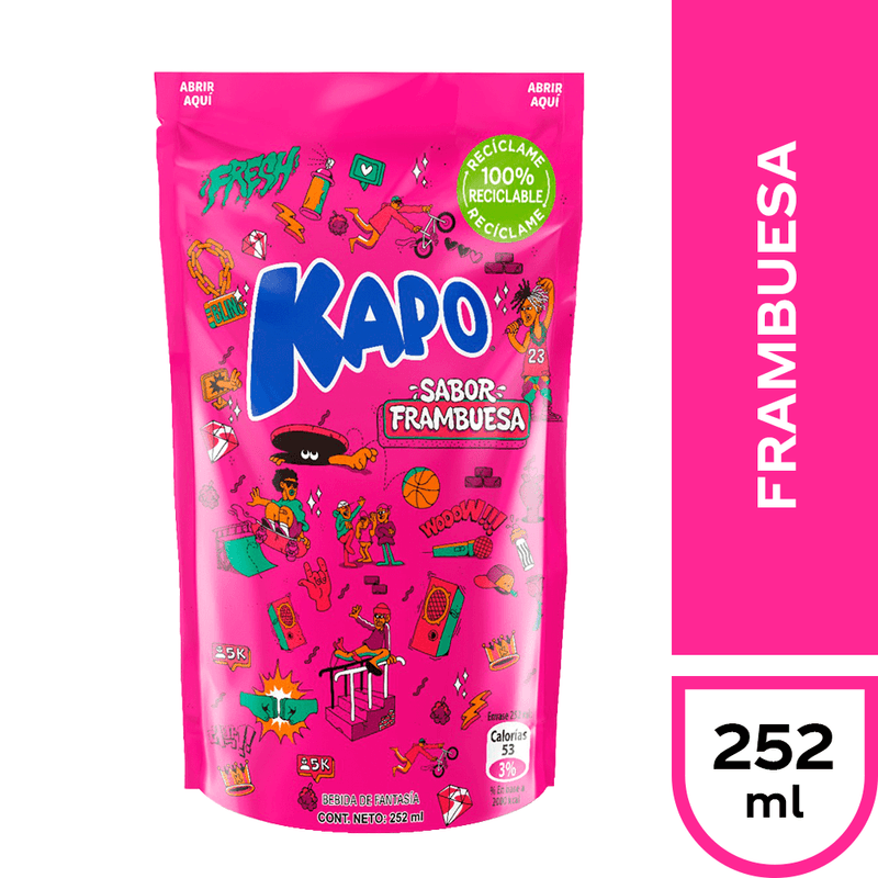 Descubre el sabor vibrante del pack Kapo Frambuesa: sachet de 252 ml lleno de la frescura y el dulzor de las frambuesas, ideal para disfrutar en cualquier momento y lugar.